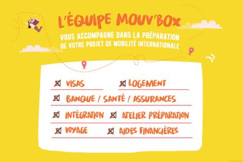 La Mouv'box est un dispositif de la Communauté d'universités et établissements de Toulouse qui propose un accompagnement personnalisé et gratuit dans l'organisation des démarches logistiques en vue d'un départ en mobilité internationale (visa, logement, banque, assurances etc.).